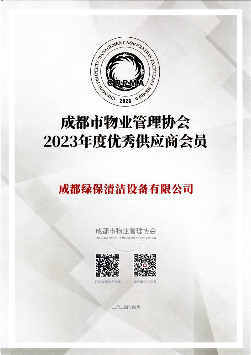 2024年4月9日,綠保榮獲成都市物業(yè)管理協(xié)會頒發(fā)的“2023年度優(yōu)秀供應商會員”榮譽證書。這一殊榮不僅是對我們過去一年努力的肯定及行業(yè)認可,更是激勵我們繼續(xù)前行的動力。