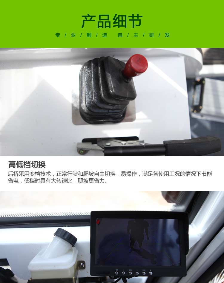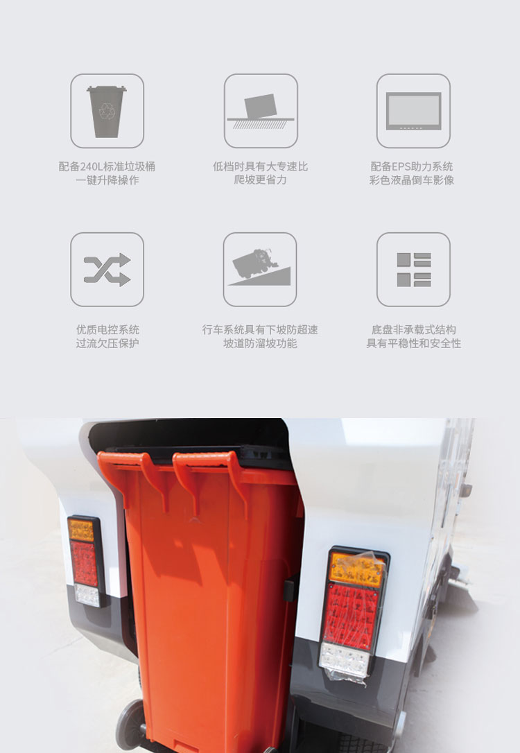 該車后橋采用變檔技術,正常行駛和爬坡自由切換。輸送桶體采用多滾刷結構,具有能耗低,噪音小,易檢修等優點。車體尾部配備240L標準垃圾桶,液壓升降,靈活換桶!